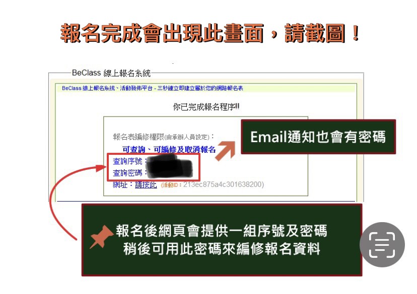研習課程報名成功,務必截圖報名專屬序號及密碼,以利日後資料更動使用。